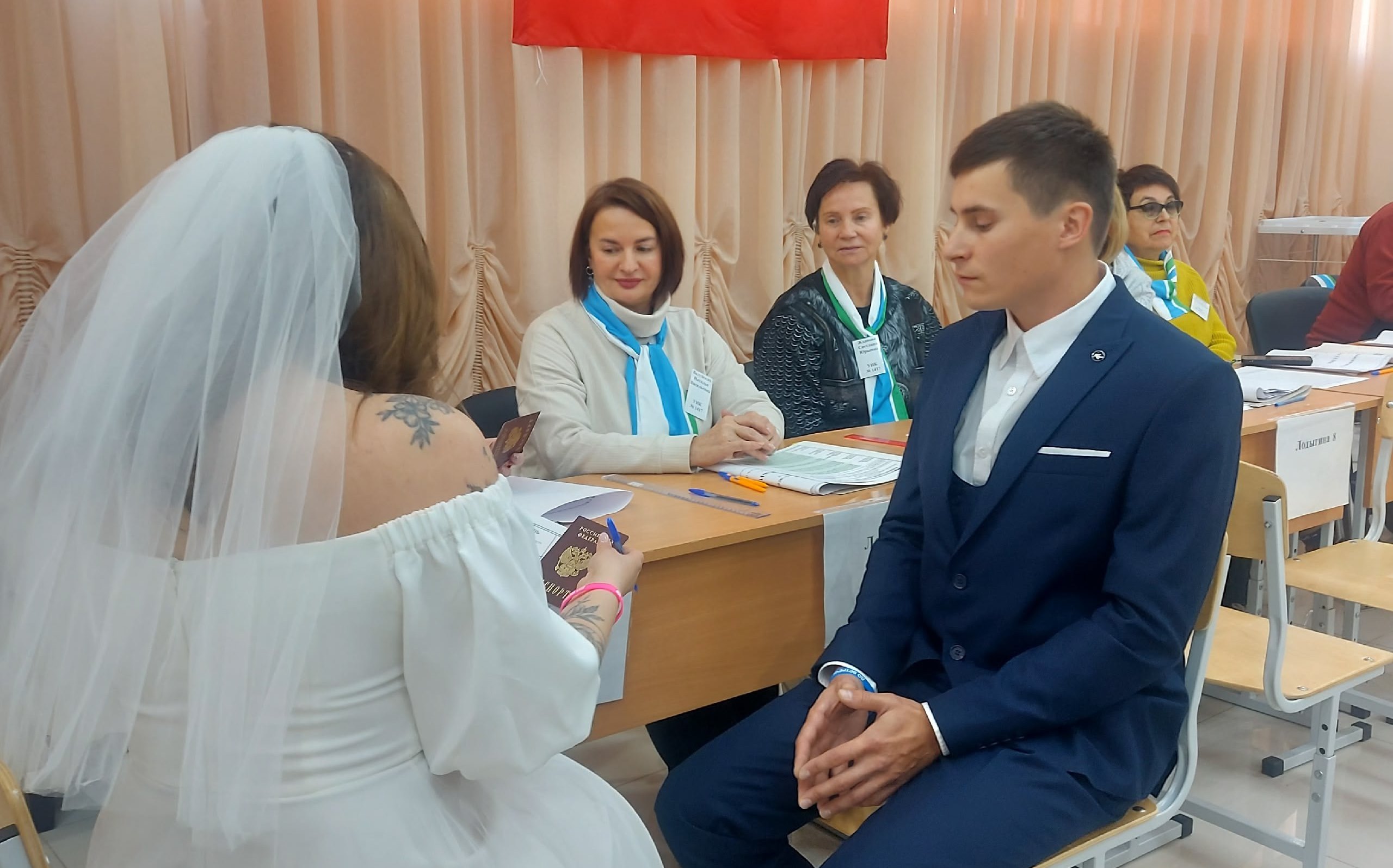 «Друзья, у нас сегодня на участке грандиозное событие! Жених с невестой после ЗАГСа сразу пришли на наш избирательный участок № 1417, чтобы принять участие в досрочном голосовании за Губернатора Свердловской области. Едва невеста переступила порог избирательного участка в своем красивом белом платье, раздались аплодисменты и громкое “Поздравляем!” членов участковой избирательной комиссии. Получив бюллетени, жених с невестой прошли в кабинки для голосования, чтобы отдать свой избирательный голос. Вот так за один день Роман и Екатерина сразу решили и будущее своей семьи, и будущее своего региона».